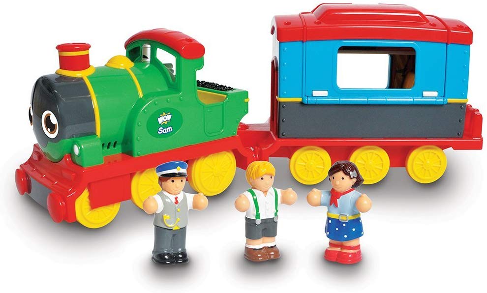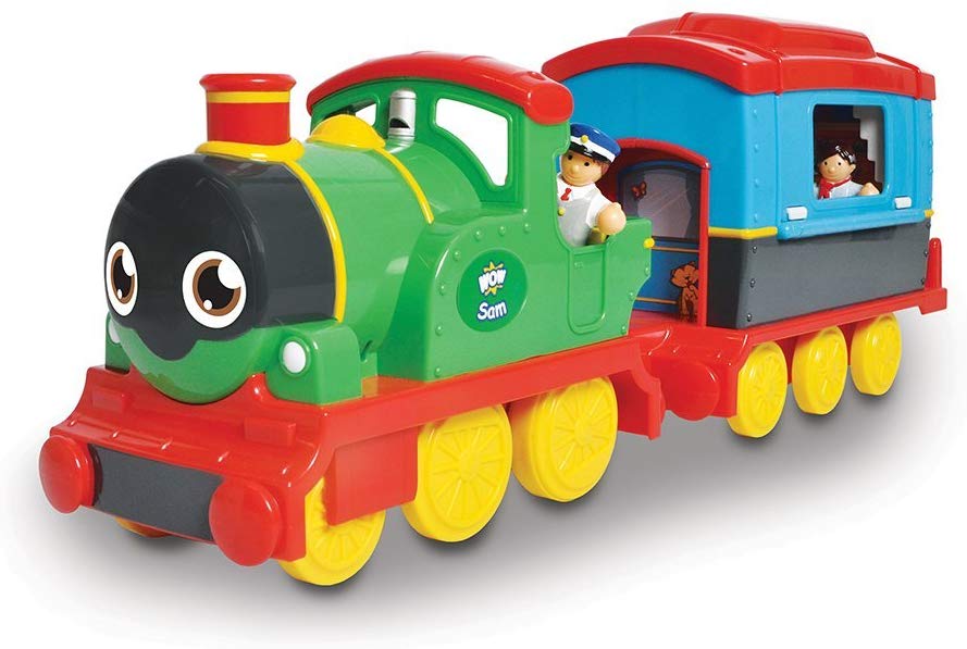 Sam's motorized steam engine is driven by Jeeves, a Jolly train driver figure. Sam pulls his detachable Coach which is designed with an opening side and roof, when opened reveals stairs from the platform into the Coach. The coach's cosy interior includes a table and chairs for passengers to sit in. Sam's push down chimney gives a whistle sound to announce he is ready to start his journey!