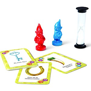 INCLUDES: 4 game boards, 12 Treasure Cards, 2 Team Cards, 4 Corner Start Cards, 2 game board holders, 2 magnetic gnome movers, 1 sand timer and instructions.