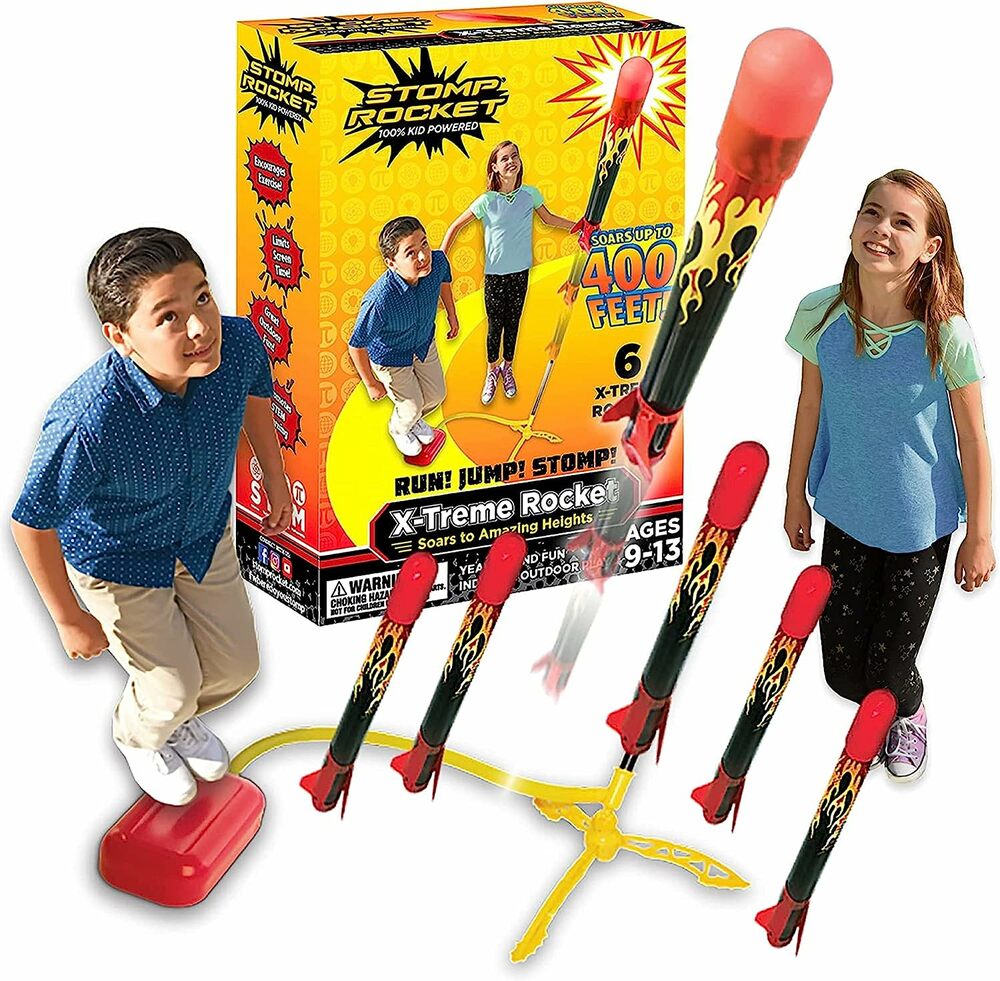 Run Jump, and Stomp! Set includes 6 X-Treme rockets and an adjustable rocket launch stand.
