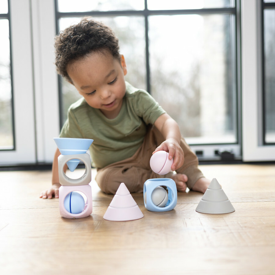 Three of your favorite Moluk toys in one unique adventure! It features the Hix - three silicone rubber cones that can fold, flip, and stack endlessly - the Mox - right-side, inside-outside face-making rubber balls - and the Oibo - a set of elastic, stackable, rollable, squeezable, easy-to-grip sensory cubes. Separate, they're each an award-winning sensory experience designed to invite open-ended exploration at varying levels of development. Together, they take play to the next level. Watch as they help your child grow, surprising you and your little one with new uses and new challenges along the way - from grasp & sense to stack & build to imagine & invent!