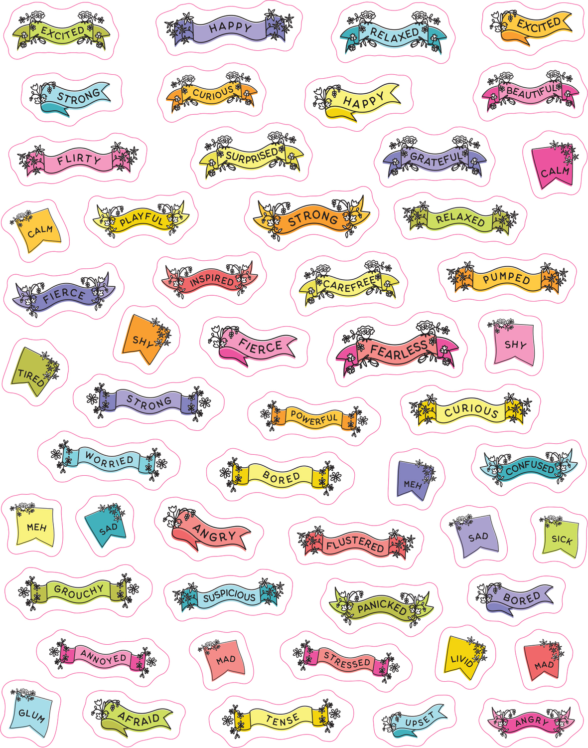 Happy. Flirty. Grouchy. Worried. All the emotions are here in words and images on bright, lively, full-color stickers. Use happy and sad emoji stickers to note your mood in your journal. Decorate a letter with bright flowers, rainbows, or dancing avocados. Pop an “Unstoppable” sticker on your planner to keep you focused on your goals, or mark the date of a big event with a sticker that shows your excitement.