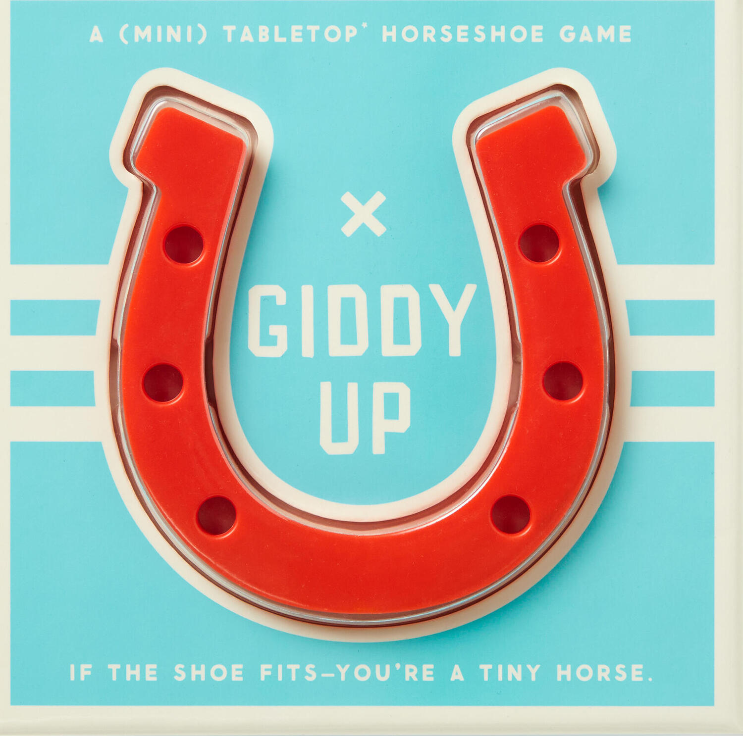 GIFT IT UP - The Giddy Up Horseshoe Game by Brass Monkey is going to be the biggest hit at your next party. It's easy to play and perfect for all ages, making it a great gift for anyone. The horseshoes are designed with rubbers and 2 goal pegs to make it compact and easy to carry around. Take turns with friends or family members to see who can score the most points! The game will keep everyone entertained so enjoy tossing those horseshoes, cowboy.