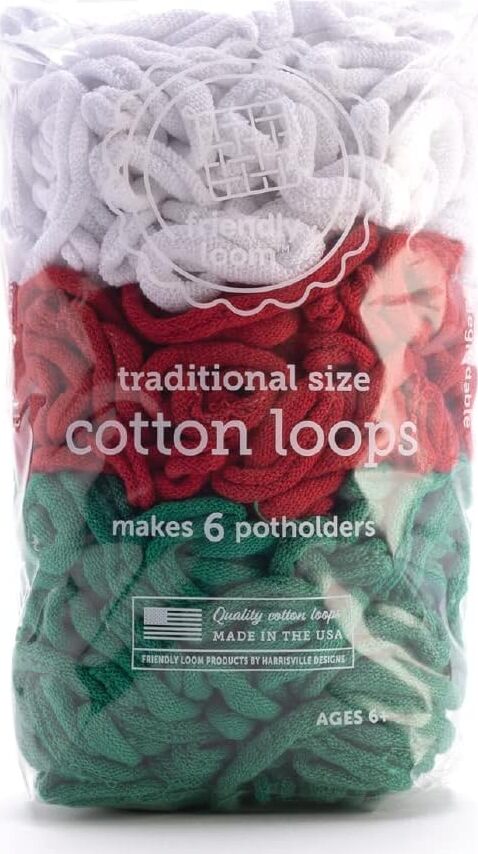 These cotton potholder loops in Holiday color mix are custom made to fit Friendly Loom™ Potholder Loom (Traditional Size). Makes 6- 6" x 6" potholders.