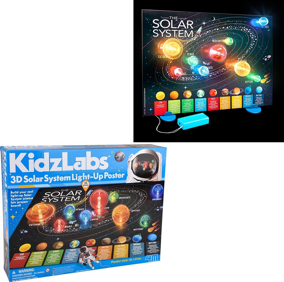 Hang it from a hook, or use the four included feet to display it on a shelf. Awe and knowledge abound with the 4M KidzLabs 3D Solar System Light-Up Poster.