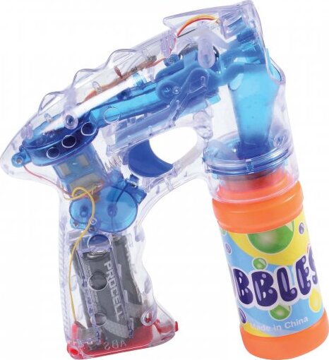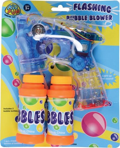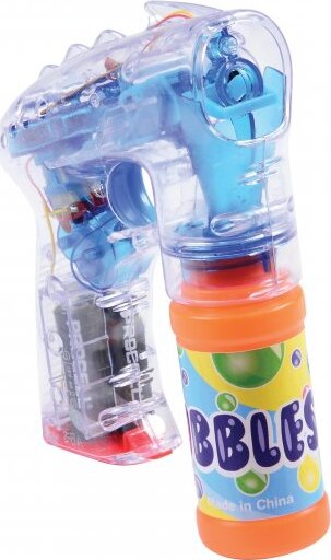 Pull trigger to activate bubbles & lightsIncludes 1 bubble gun, bubble solution & batteriesMade of plasticItem 5.5" L. x 6.5" T.6 pieces per unitAge 3+