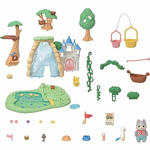 A lush waterfall adventure with a secret forest full of fun trick, adventure accessories and a treehouse for Babies! Gift Set includes Husky Baby Rinnea who is dressed for exploration and carries a lantern, a flag, a fishing rod, and an explorer's hat and is ready to set off on an adventure! Explore all of the Secret Forest Falls including secret caves, an ivy ropeway and boat in search of the treasure chest!