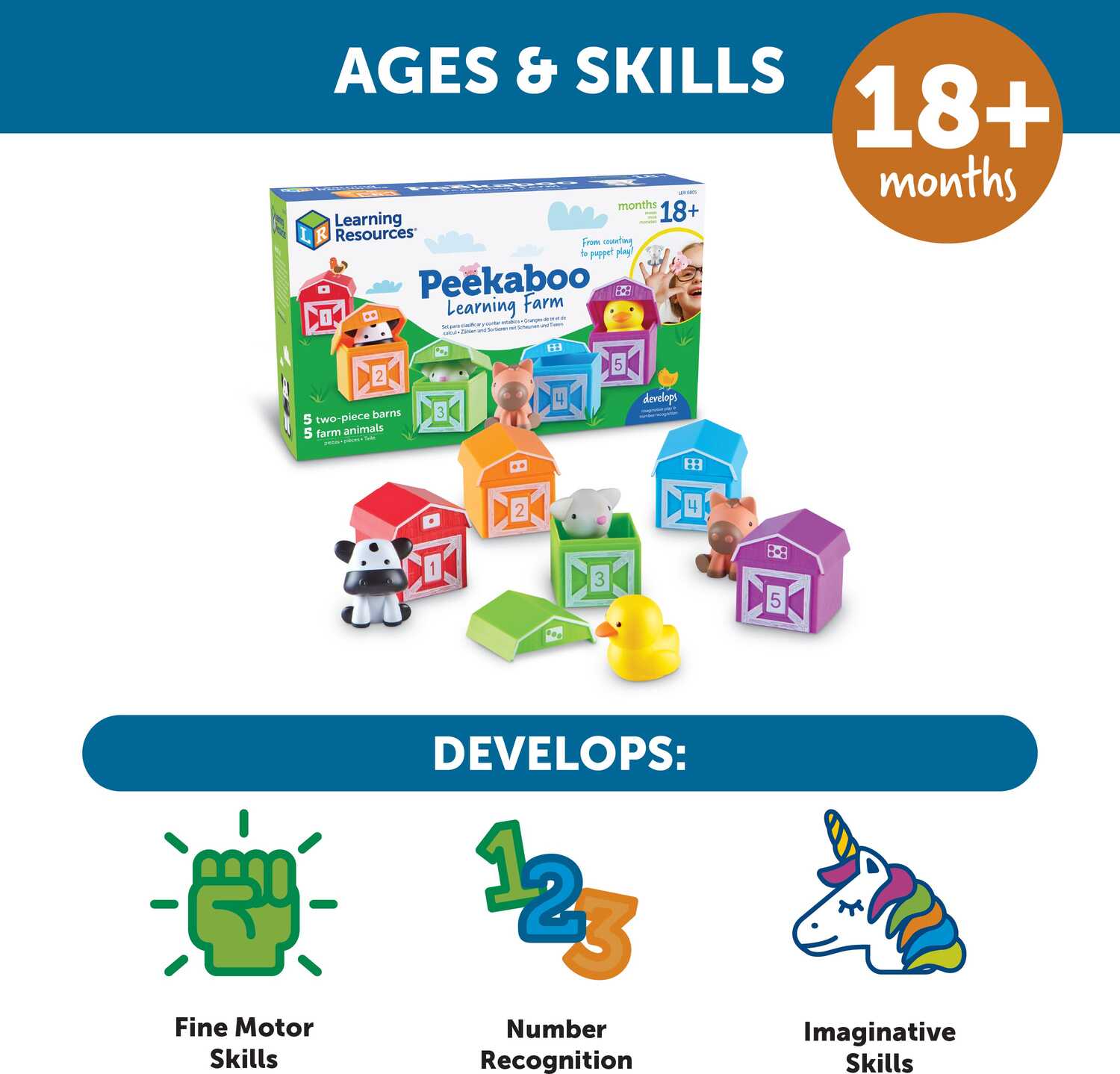 There's more than hay inside these barns- there's farmyard learning fun! Kids learn counting, color, matching, and sorting skills during every imaginative adventure with the farm friends found within the Peekaboo Learning Farm. Each of the set's 5 numbered two-piece barns comes in a different vibrant color, including red, orange, blue, green, and purple. Each barn also pops open to reveal 5 different animal finger puppets- meet the set's friendly cow, pig, duck, and more! Unlike many toys for toddlers, the Peekaboo Learning Farms grows along with your little one- build new fine motor skills during early games of pretend, then move on to early math and color identification! Find the animals during games of hide and seek, make your own memory game, or just let your imagination go! The Peekaboo Learning Farm's two-piece barns also help kids build coordination and other fine motor skills every time they pop them open or snap them shut.
