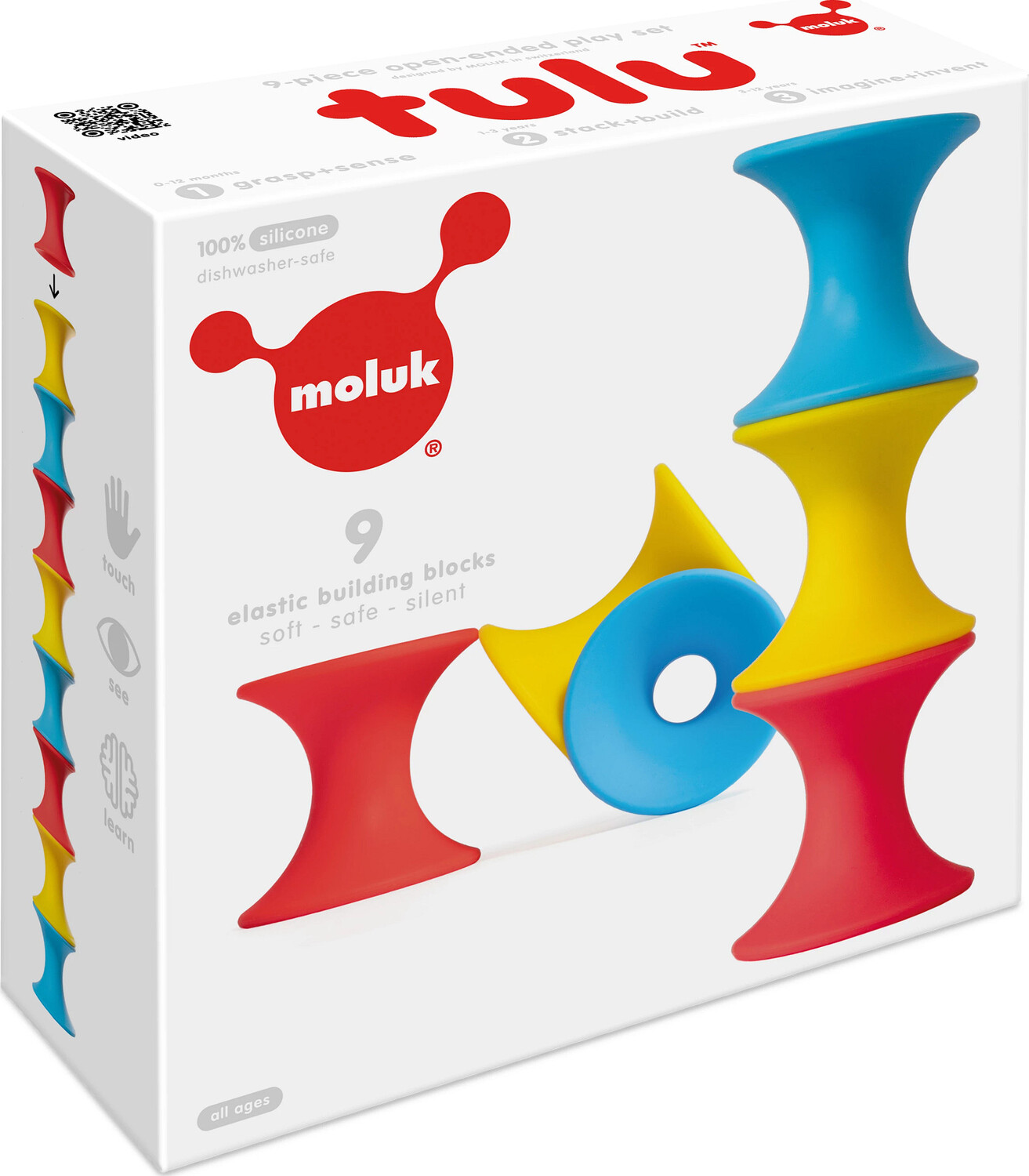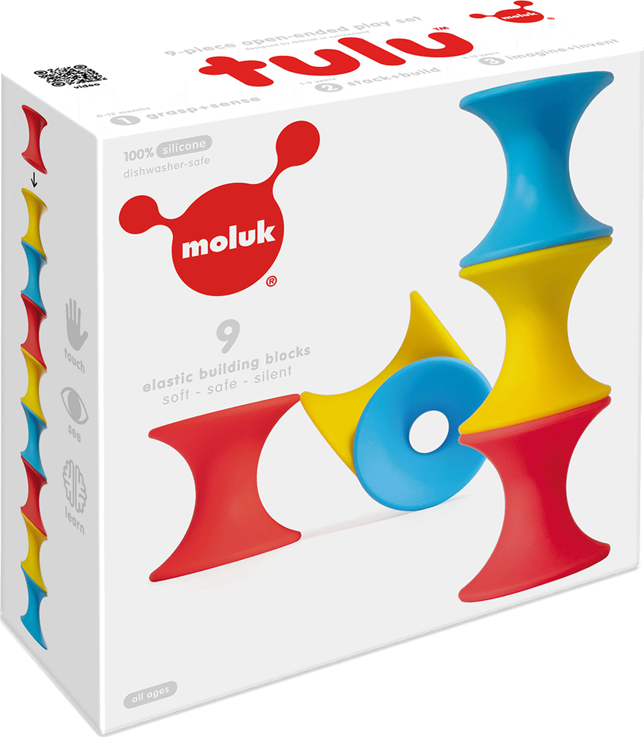 Tulu by MOLUK Silicone spool-shaped toys for open-ended creative play Encourages fine motor skills, spatial reasoning, creativity. So many unique ways to explore and play Choose either the 3-piece set or 9-piece set Each Tulu measures 2 x 2 x 2 inches Thread and other MOLUK toys not included Made of 100% silicone Ages 0+