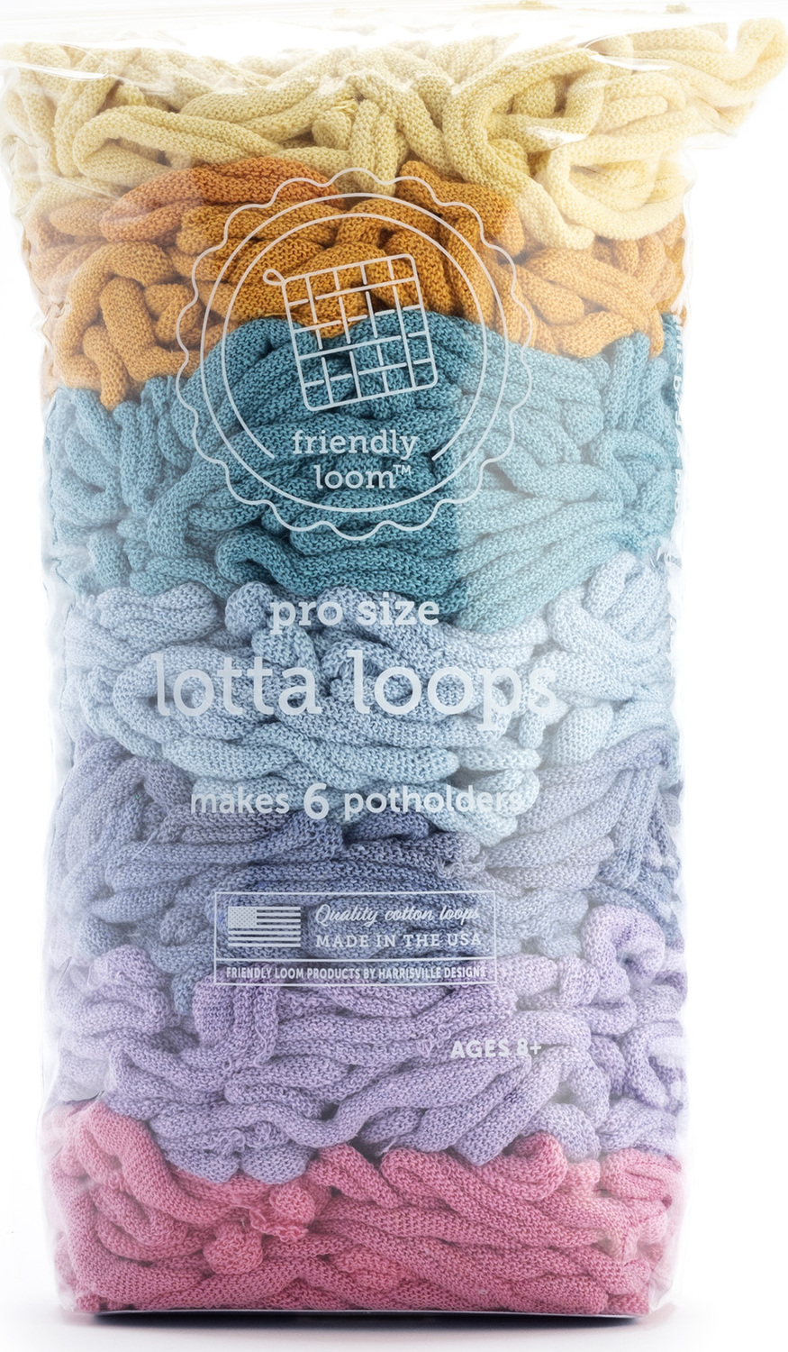 These cotton potholder loops in Botanical color mix are custom made to fit Friendly Loom™ Potholder PRO® loom. Makes six 8" x 8" potholders.